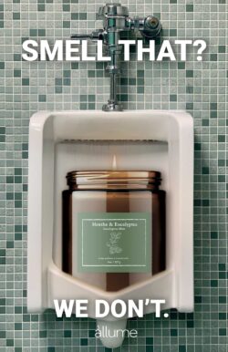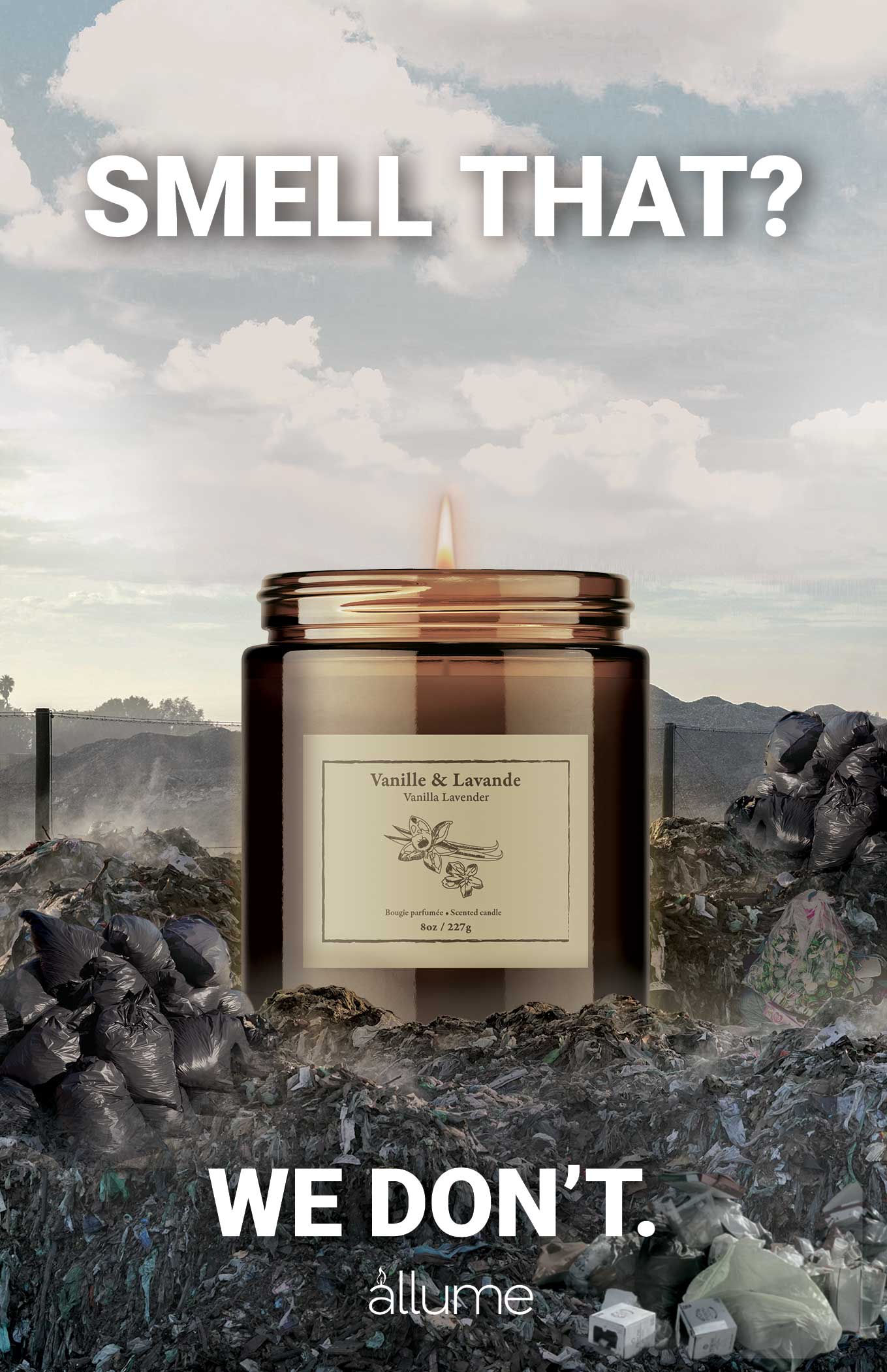 We were asked to create a guerrilla marketing campaign for our brand. I wanted to make something bold and visually different from the rest of our branding in order to grab consumers’ attention. I created three posters in Photoshop, each featuring one of our scented candles in a smelly environment with the slogan “Smell that? We don’t.” The goal was to imply that our candles smell so good that when lit, any foul odours vanish.